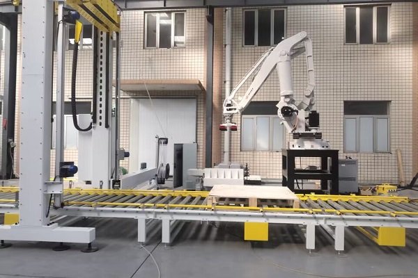軍工行業(yè)包裝線的最大特點就是物料重、體積大,因此在碼垛機器人的選擇上也必須配套大負載、頻率高且運行穩(wěn)定的設備,同時可配以頂壓機芯捆扎機,實現(xiàn)PET帶的井型捆扎,可將物料與托盤緊密的固定,同時配以懸臂纏繞包裝機,實現(xiàn)雙重保護。