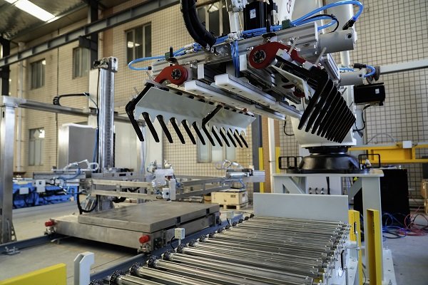 袋碼垛包裝線必備的幾大部件包括:倒袋機(jī)構(gòu)、轉(zhuǎn)向機(jī)構(gòu)、震動(dòng)整平、壓包以及抓取。但由于用戶場(chǎng)地上的一些局限性,但速度有特別高的強(qiáng)烈需求,因此在制作過(guò)程中,艾訊工程師充分發(fā)揮創(chuàng)造性,將原本應(yīng)該直行的輸送機(jī)做成無(wú)動(dòng)力斜坡式,既解決了場(chǎng)地問(wèn)題,又兼顧了效率問(wèn)題。